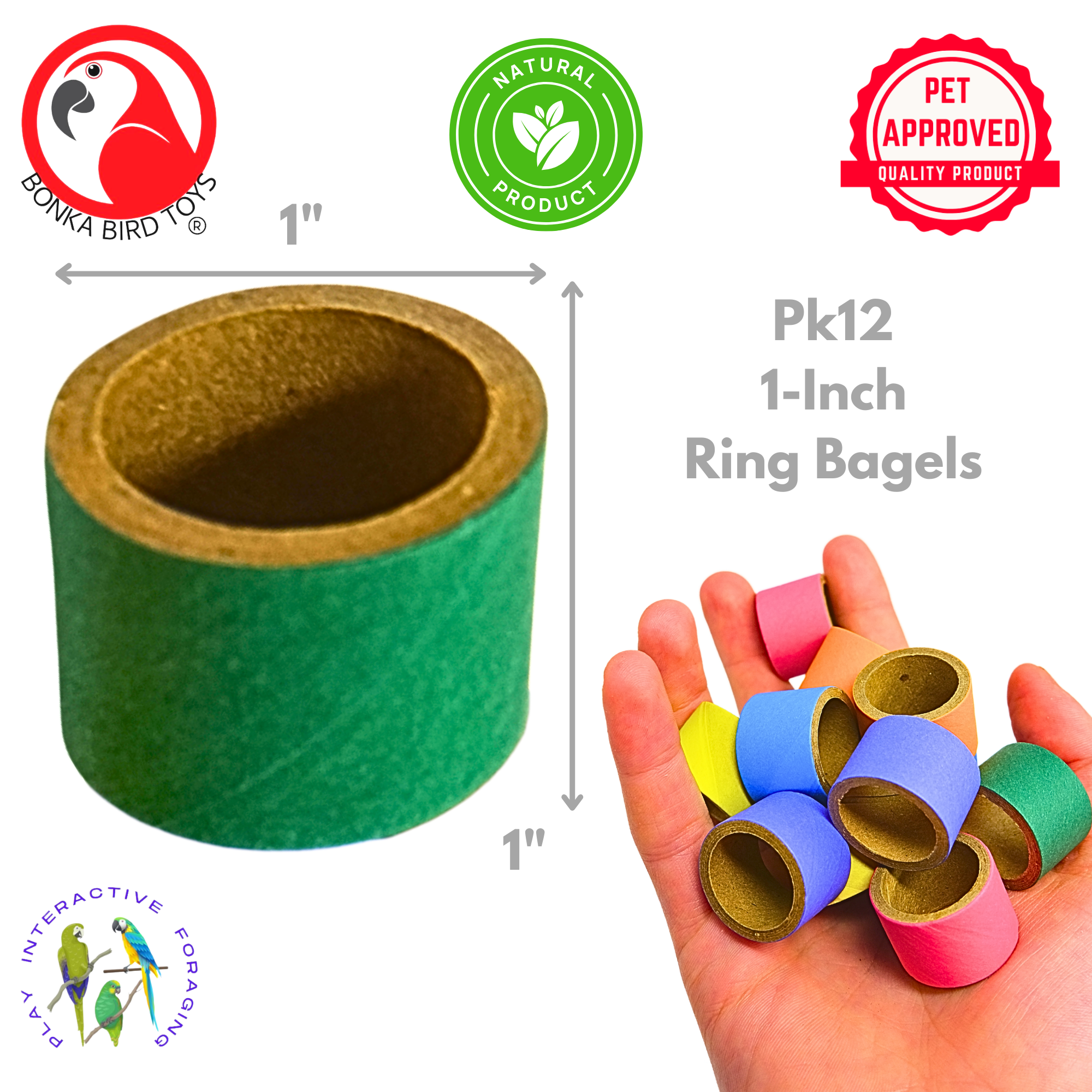 Treat your bird to hours of entertainment with the Bonka Bird Toys 3160 12pk 1-Inch Ring Bagels—the perfect foot toy designed for shredding, chewing, and foraging. Each pack includes 12 colorful, 1-inch cardboard ring bagels that are layered for satisfying peel-and-shred action. Crafted from compressed cardboard with a vivid outer ring, these toys stimulate your bird’s natural instincts while keeping them engaged and happy.