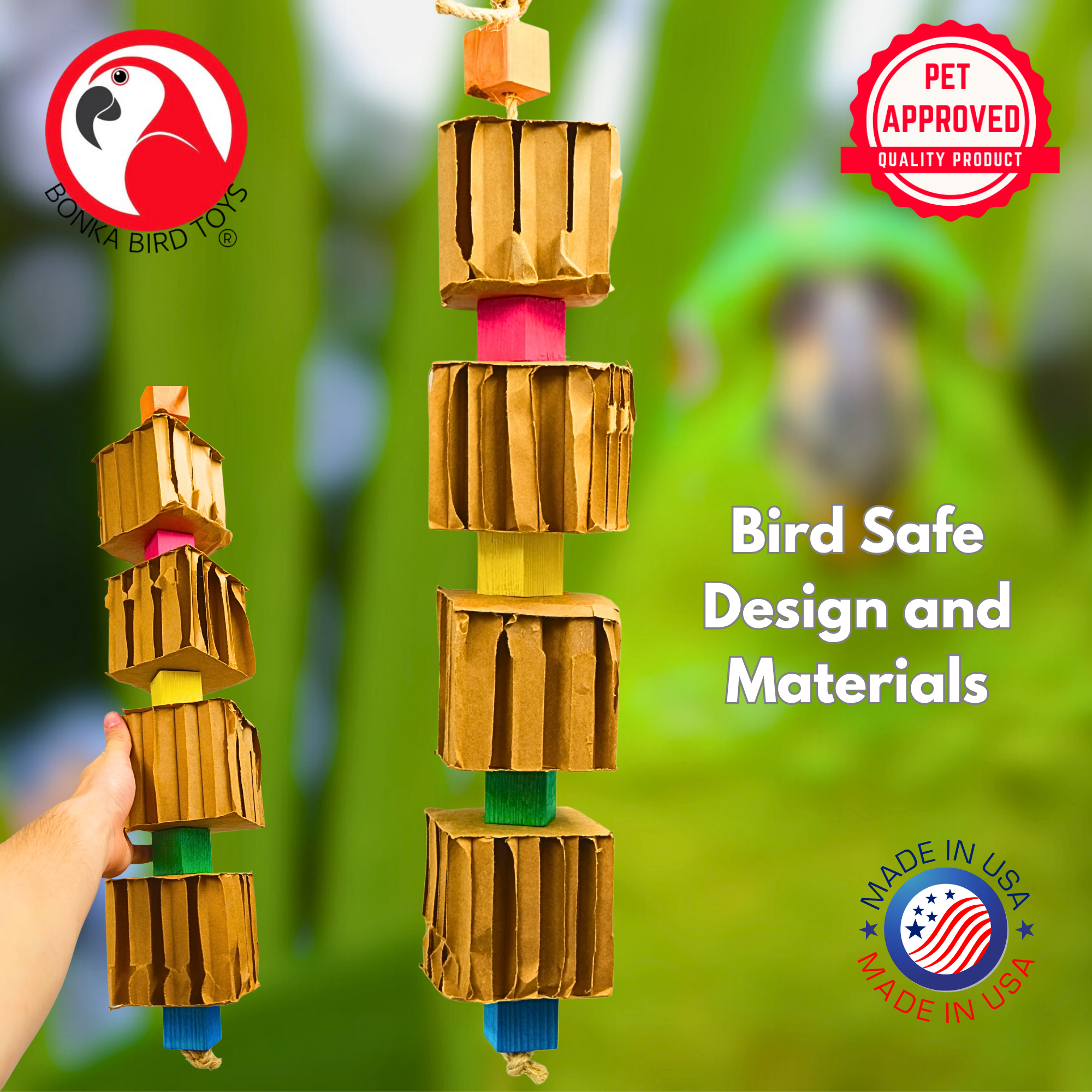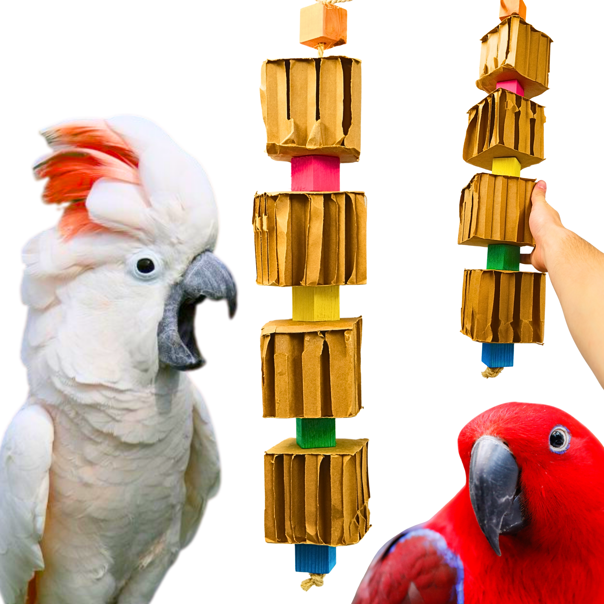 Crafted with alternating large cardboard cubes and colorful wooden blocks, this toy supports both destructive and gnawing behaviors—ideal for parrots who love to stay busy! The cardboard satisfies the need to shred, while the hardwood helps maintain beak health.