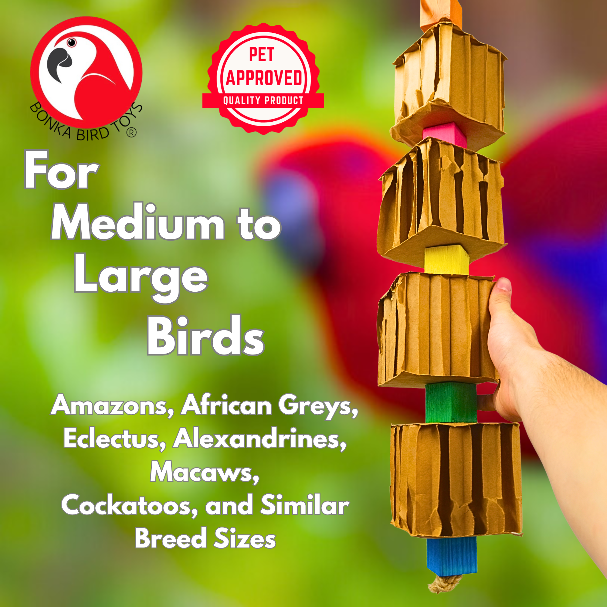 Unleash your bird's natural instincts with the 3750 Big Quad Blocks N Cube from Bonka Bird Toys! Designed for medium to extra-large birds, this engaging bird toy is a satisfying mix of shreddable and chewable elements that encourages healthy play.