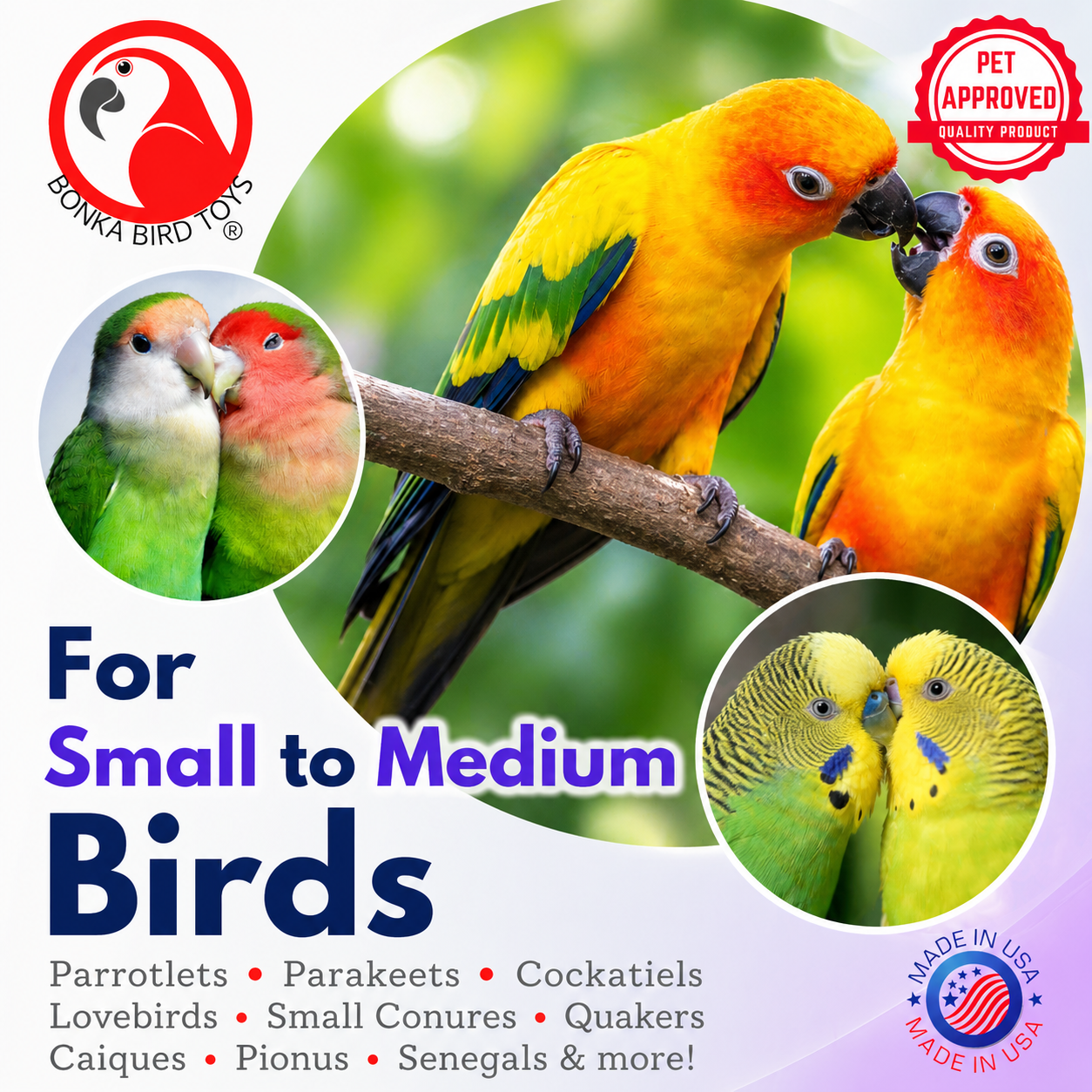 Great for many small and medium parrots, including Conures, Quakers, Caiques, Ringnecks, Pionus, Senegals, Meyers, Alexandrines, Amazons, Eclectus, Jardineโs Parrots, and similar-sized birds.