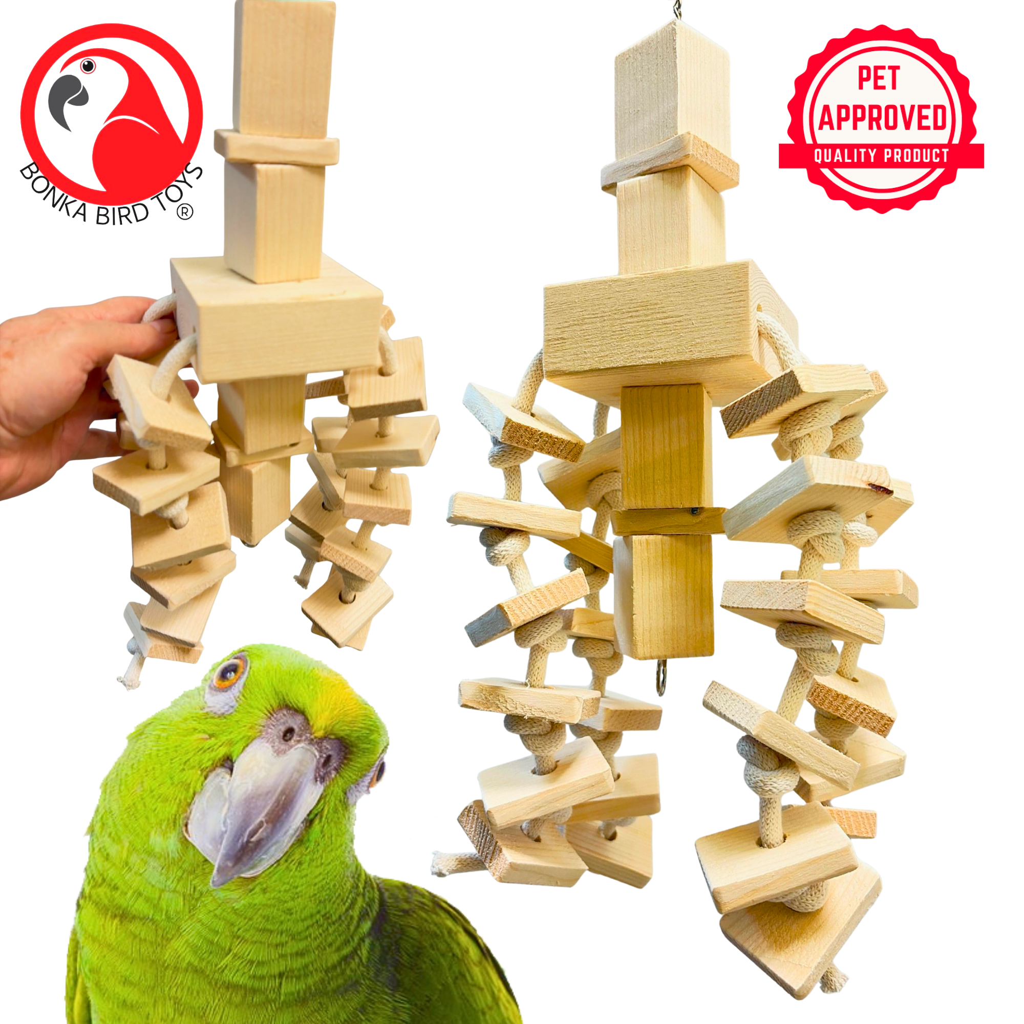 Made with durable wood and strong cotton rope, this toy includes a secure quick link for effortless cage attachment and long-term use.